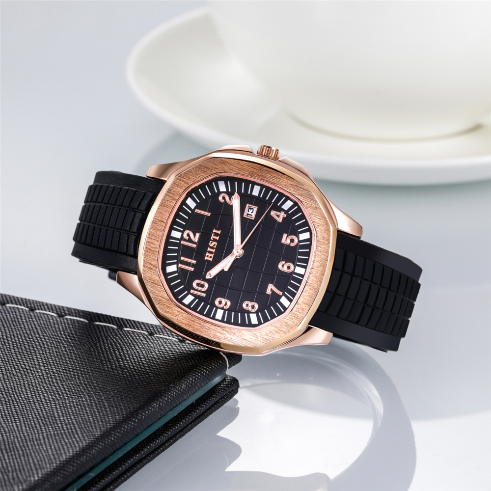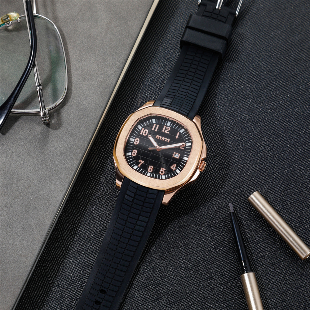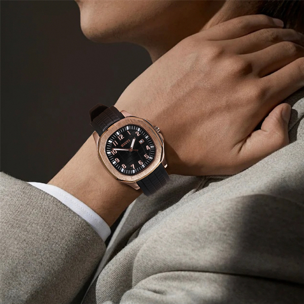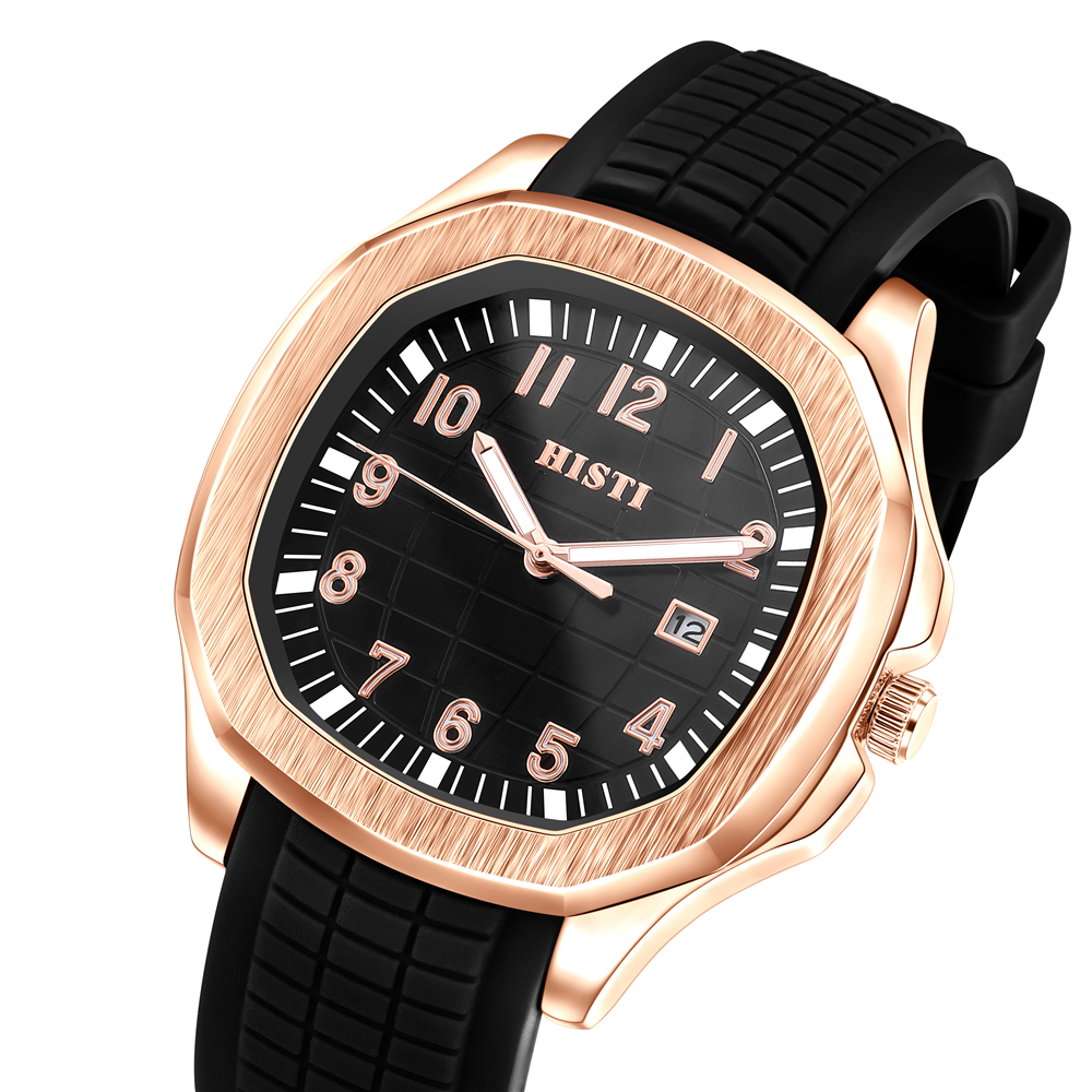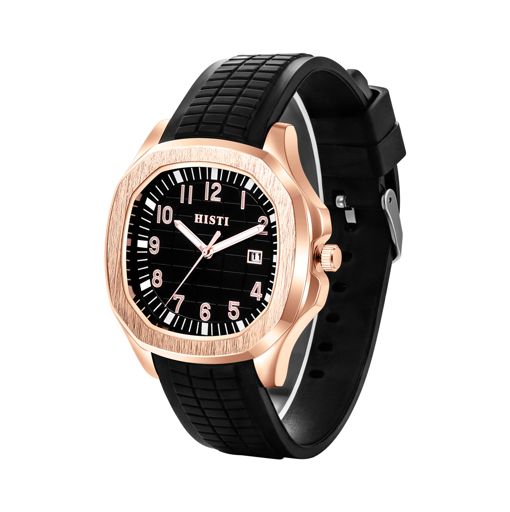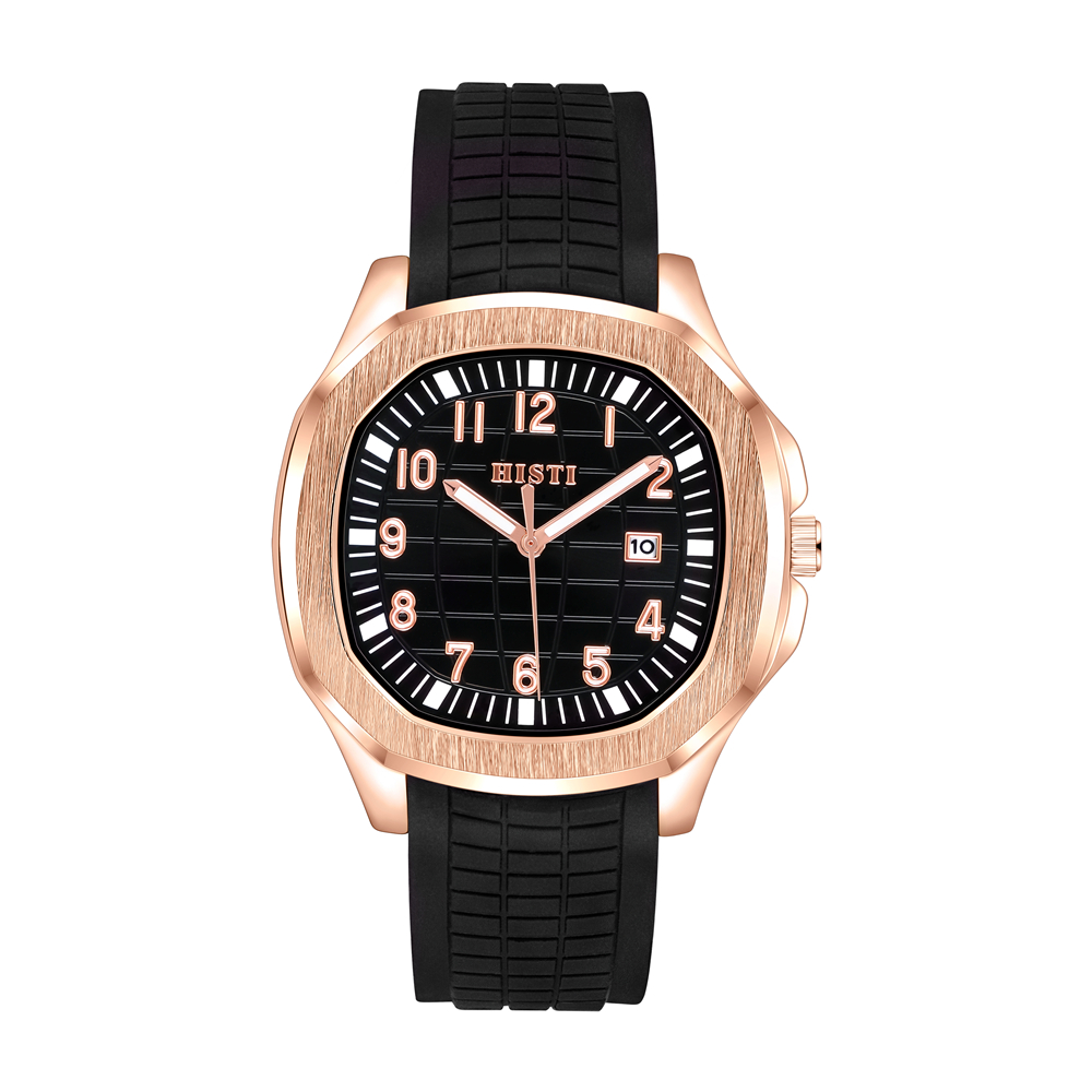 Square rose gold case paired with a matte black silicone strap features sharp lines and a subtle luxury finish, blending sporty style with sophistication to complement any outfit for various occasions.